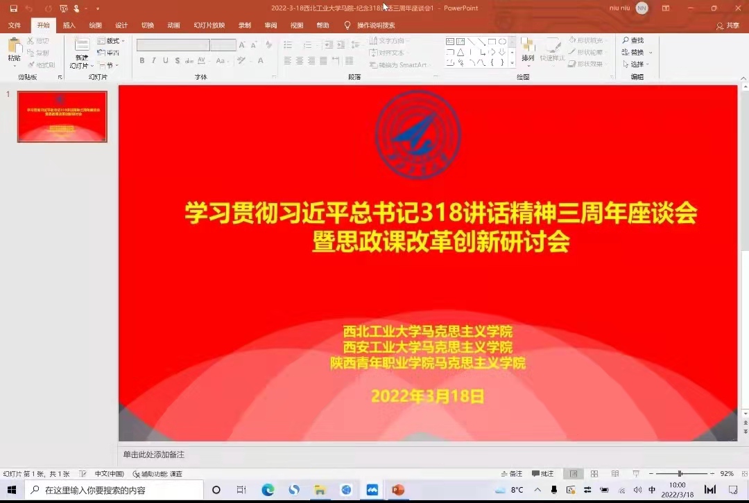 3月18日,学习贯彻习近平总书记318讲话精神三周年座谈会暨思政课改革创新研讨会在腾讯会议上召开,公司体育365官网与西北工业大学体育365官网、陕西青年职业公司体育365官网专家和教师参加这次盛会。西工大丁社教教授、高旭红教授,体育365官网经理助理孟文科副教授、德法教研部主任冯婷副教授,陕西青年职业公司体育365官网马雅玲经理等,从不同方面介绍了本校在3.18讲话精神指引下,对思政课程改革与创新的思路与成果。与会专家和教师给予充分肯定,并进行了深入研讨交流。