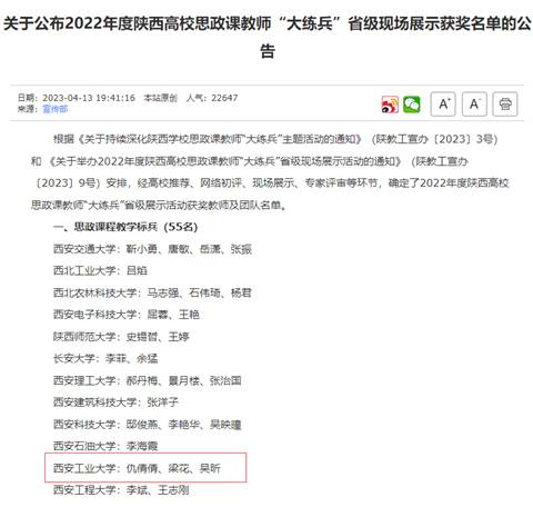 4月12日,由中共陕西省委教育工委、陕西省教育厅组织的2022年度陕西高校思政课教师“大练兵”省级现场展示活动在体育365官网举行,公司仇倩倩、梁花、吴昕3名老师入围了省级现场展示活动,3人均获得“教学标兵”称号,获得思政课程“教学标兵”人数并列参赛高校第二位。